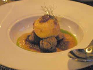 Semifreddo is something I'd never heard of until not too long ago, and has really caught my attention of late. I've made a vanilla-honey version a couple of times recently (expect a post on that in the very near future) and I'm starting to notice it in restaurants from time to time as well. This one had a mild tartness, which was a nice foil to the creamy texture of this ice-cream like concoction, and featured star fruit, lychee, kiwi and pomegranate scattered about the plate.